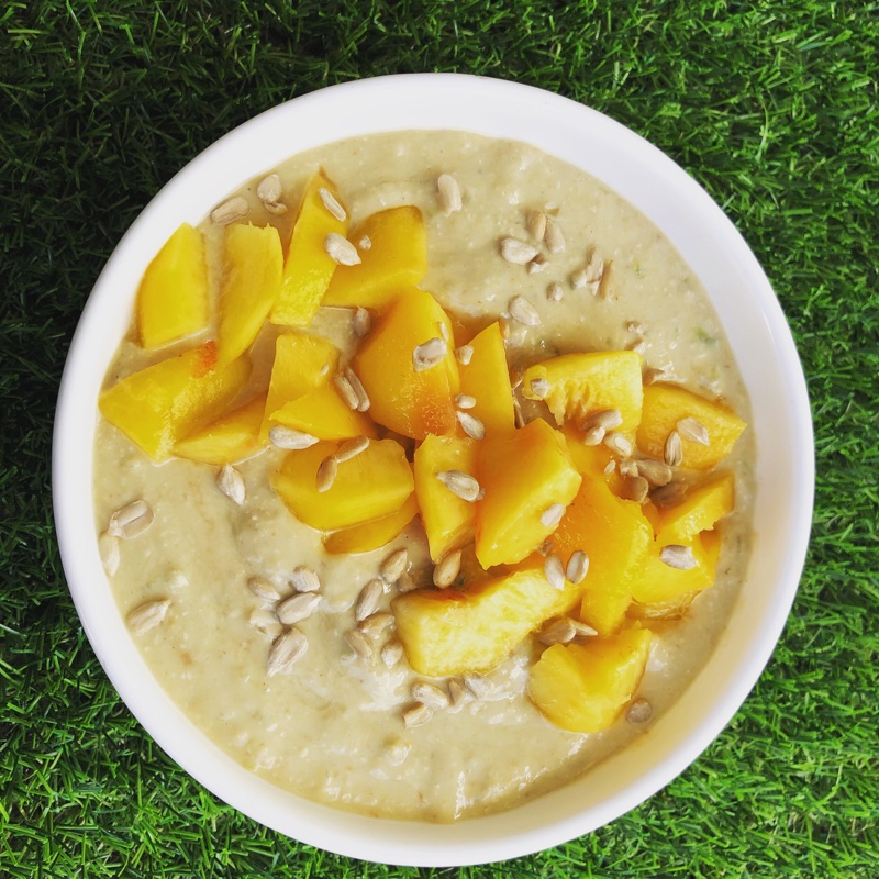 Colocar os toppings que gostar. Eu coloquei um pêssego cortado em pedaços e sementes de girassol e combinou muito bem